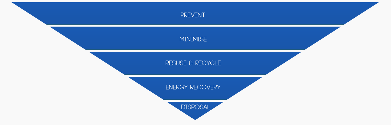 Nicole & Kingswill Limited healthcare waste management strategies aim support you through the implement the waste management hierarchy (Figure 2.0 below). Our framework prioritise waste management options in terms of environmental impact. The first step in good waste management practise is to prevent or minimise the waste we produce. If waste production cannot be prevented, then reuse and recycling are the next preferable options. Generating energy from waste is the next option, while the least favoured option is disposal.